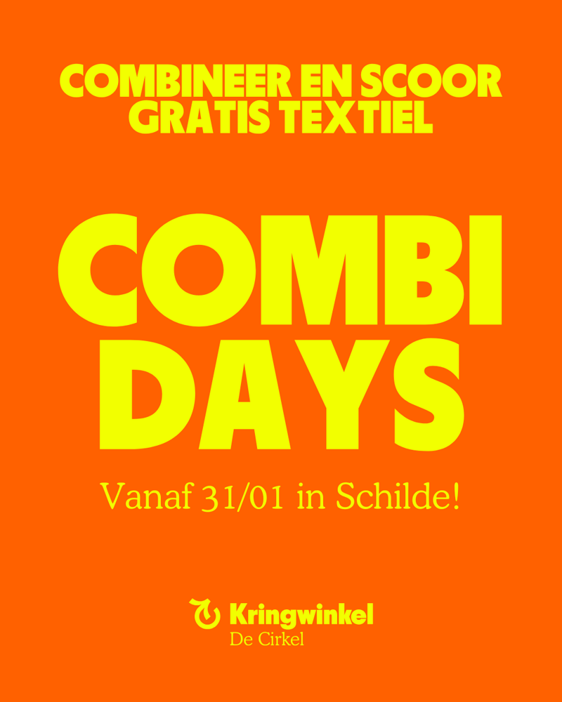 Tijd om je garderobe aan te vullen! Tijdens de Combi Days in Schilde profiteer je van een 2 + 1 gratis actie op textiel. Scoor mooie tweedehands kleding, mix en match en geef je outfits een tweede leven.