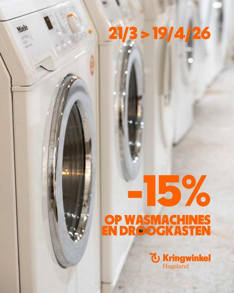 Voorwaarden: de actie ‘-15% op alle wasmachines en droogkasten’ loopt van 21 maart 2026 tot en met 19 april 2026 in de Kringwinkels te Aarschot, Diest, Tienen, Landen, Glabbeek en Tielt-Winge. De korting wordt verrekend aan de kassa. Deze korting kan nooit omgezet worden in contanten en is niet cumuleerbaar met andere kortingen. Alle andere (verkoops)voorwaarden Kringwinkel (Hageland vzw) blijven ook steeds gelden.
