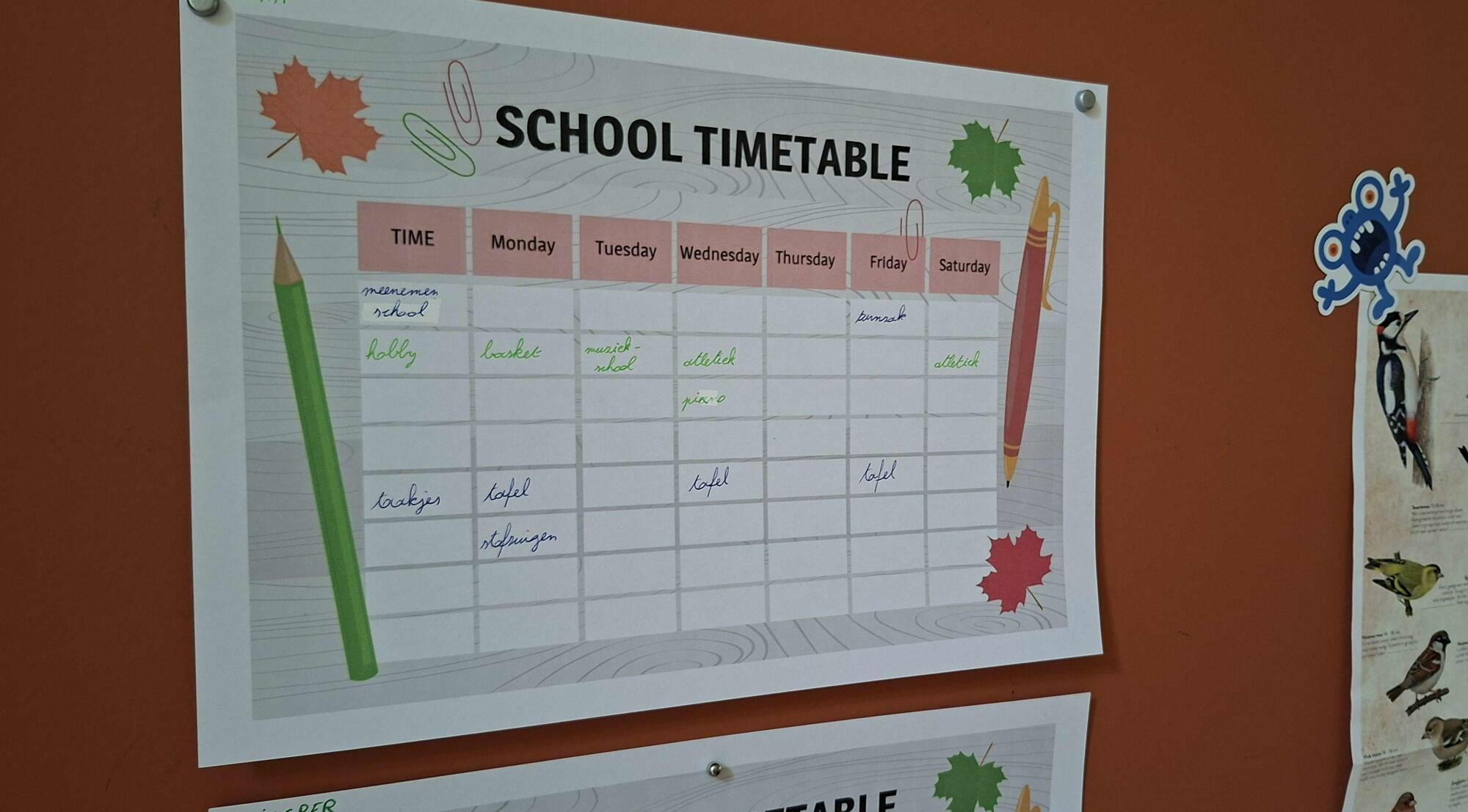 En ook een duidelijke planning helpt enorm. Ze weten op school precies wanneer speeltijd, turnles of knutseltijd is. En thuis kan dat net zo handig zijn.